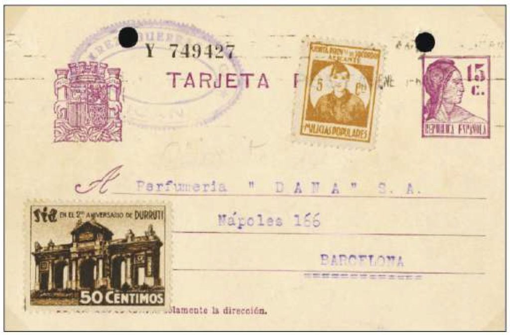 Estas viñetas, destinadas generalmente a financiar a las “Milicias Populares” se utilizaron en la correspondencia y sobre otros documentos durante la Guerra Civil Española en Alicante con un mismo valor y diferentes tipos de dentado.
