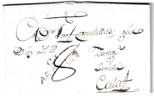Carta fechada el 19 de octubre de 1806, enviada desde Caspe con destino a Calaf. Presenta la distintiva marca prefilatélica «CE ARAGON» estampada en tinta negra, característica de la correspondencia enviada desde esta localidad en el siglo XIX. Además, se aprecia un porteo manuscrito de 8 cuartos en tinta negra, reflejando la tarifa aplicada en la época para el franqueo de este tipo de correspondencia.