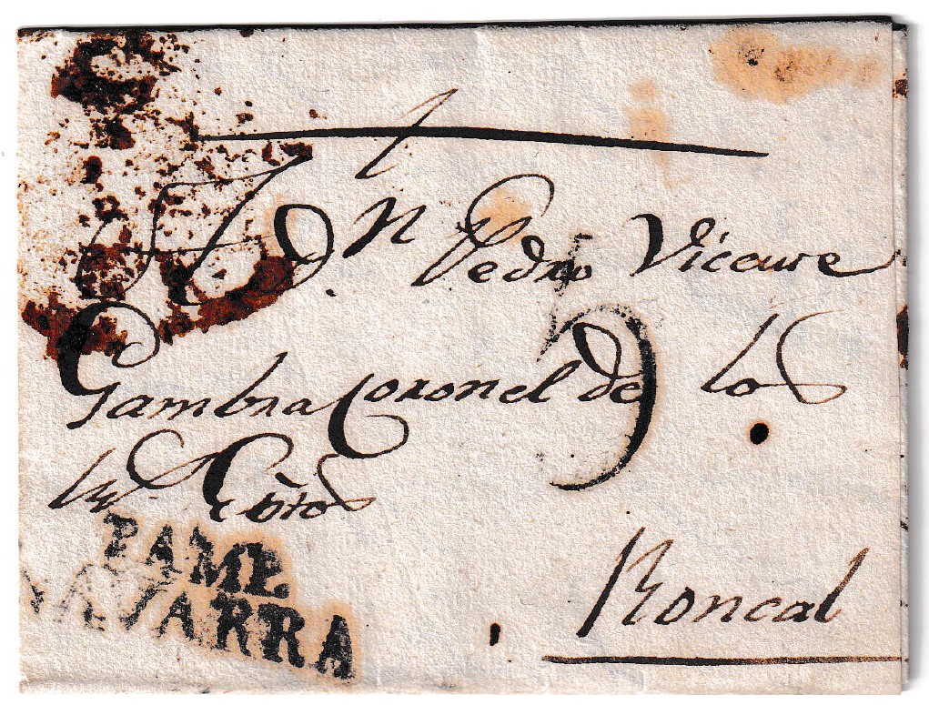 Carta enviada en 1820 desde Pamplona con destino a Roncal, un testimonio postal de gran interés histórico. Esta carta, dirigida al coronel de infantería Pedro Vicente Gamboa, conserva la marca de origen de Pamplona claramente estampada, resaltando la importancia de esta ciudad como punto clave en las comunicaciones de la época. El porteo de 5 cuartos en tinta negra añade autenticidad a esta pieza, reflejando las tasas postales vigentes en el primer cuarto del siglo XIX.