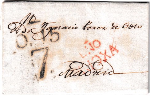 Carta prefilatélica de 1822, enviada desde Logroño a Madrid. La misiva está fechada el 11 de octubre de 1822, plena época del Trienio Liberal. Destaca por llevar la rara marca LÑO RIOXA impresa en tinta roja, una de las variantes menos frecuentes utilizadas en la región riojana durante este periodo. Esta señal postal es característica de las primeras décadas del siglo XIX, y su presencia aporta valor tanto postal como histórico a la pieza.