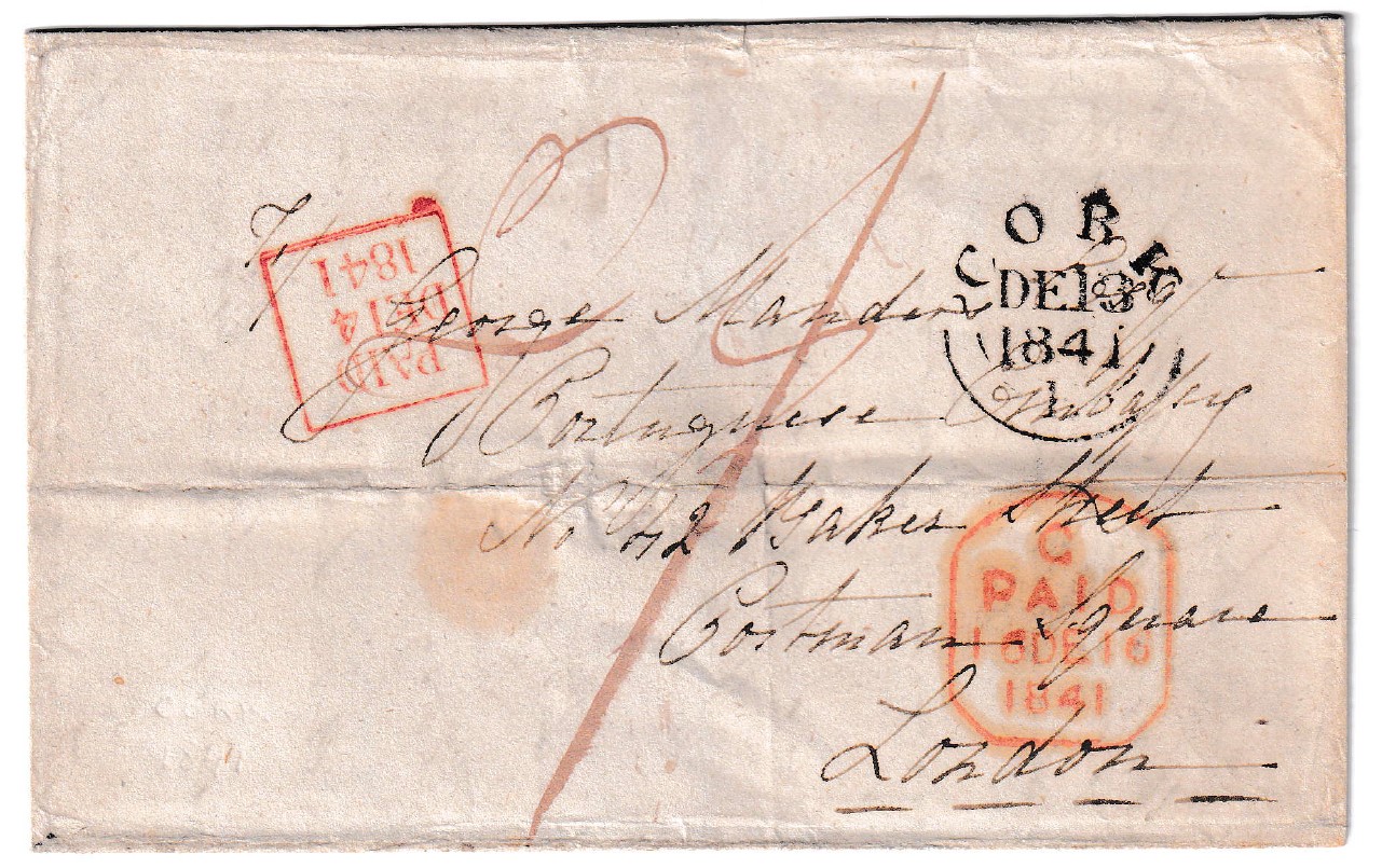 Carta de 1841 enviada desde Cork con destino a Londres, un claro ejemplo del uso postal en la época anterior a los sellos de uso generalizado. Esta pieza destaca por su marca manual de Cork en tinta negra, acompañada de una igualmente interesante marca de «pagado» (Paid) estampada en rojo en Londres, que señalaba el franqueo previo de la misiva y refleja la práctica administrativa del sistema postal decimonónico. Estas marcas no solo aportan valor filatélico, sino también histórico, al documentar los recorridos y procesos postales de la época.