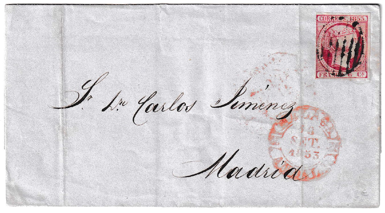 Envuelta de Málaga a Madrid (1853), una pieza singular de la historia postal española. Esta correspondencia, fechada el 18 de septiembre de 1853, fue enviada desde la ciudad andaluza de Málaga hacia la capital, Madrid, dejando como testimonio el claro matasellos de Baeza propio de la época. En su frontal se encuentra el sello de 6 céntimos rojo, cancelado cuidadosamente con un matasello de parrilla negra, un detalle que añade autenticidad y un claro valor histórico para los coleccionistas especializados en prefilatelia y filatelia clásica.