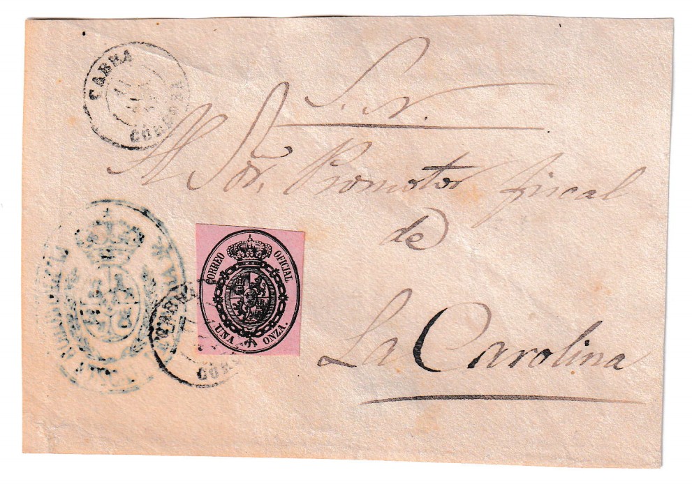 Carta prefilatélica de 1853, enviada desde Cabra a La Carolina el 11 de junio de 1853, una pieza auténtica del periodo anterior a la implementación de los sellos reglamentarios en España. El sobre conserva aún su sello de Correo Oficial para el porte de 1 onza, impreso en papel con fondo rosa, característico de los envíos administrativos de la época. Esta correspondencia representa un testimonio directo de las comunicaciones oficiales en una etapa clave del siglo XIX, cuando el sistema postal español aún transitaba hacia la uniformización filatélica moderna.