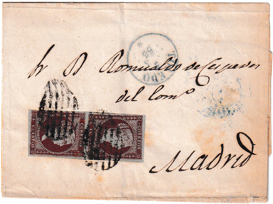 Envuelta de 1855, enviada desde Toledo con destino a Madrid, portando un doble porte de 4 cuartos rojo. Esta pieza de prefilatelia conserva su autenticidad con la vivacidad del matasellos toledano nítidamente estampado, reflejando el tránsito postal de mediados del siglo XIX. El sello, que corresponde al reinado de Isabel II, mantiene un color vibrante, característica destacable para los coleccionistas de cartas postales históricas. La envuelta presenta signos de manejo propios de su antigüedad, como ligeras marcas en los bordes, pero sigue siendo un documento intacto y bien conservado que atestigua el sistema de correo de esta época.