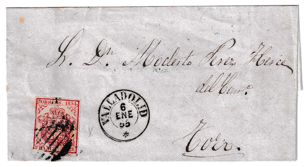Envuelta circulada el 6 de enero de 1855, enviada desde Valladolid con destino a la ciudad de Toro. La carta porta un bonito ejemplar de 4 cuartos de la serie Escudo de España fondo blanco (Tipo 33) cancelado con un matasellos de parrilla, aplicado en color rojo. Esta emisión es una de las más representativas del periodo prefilatélico español, y la presencia del matasellos en tinta roja le confiere un carácter singular, ya que no era el tono habitual para este tipo de cancelaciones.