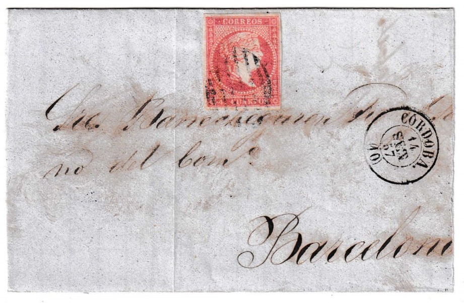 Envuelta circulada el 14 de septiembre de 1857, remitida desde Córdoba con destino a Barcelona. La pieza presenta un sello de 4 cuartos color rojo, correspondiente a la emisión de 1855, perfectamente franqueado con un matasellos de parrilla en tinta azul, variedad poco común que añade valor y atractivo a la pieza. El matasellos conserva una marcación nítida, lo que subraya la cuidada conservación del conjunto.