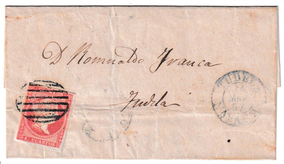 Envuelta circulada el 14 de marzo de 1857, enviada a Tudela, un testimonio excepcional de la correspondencia en la España de mediados del siglo XIX. La pieza presenta un matasellos de parrilla azul, aplicado sobre un sello de 4 cuartos rojo, color característico de esta época y valor facial común en el franqueo nacional. Uno de sus mayores atractivos radica en un error de impresión claramente visible en la esquina inferior derecha del sello, un detalle poco frecuente que incrementa considerablemente su interés filatélico.