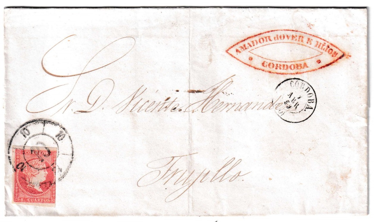 Envuelta circulada desde Córdoba con destino a Trujillo, fechada el 7 de abril de 1859. La pieza presenta un bonito matasellos de rueda de carreta nº10 aplicado con nitidez sobre un sello de 4 cuartos color rojo, emisión de la reina Isabel II. Este tipo de cancelación fue utilizado en la época para inutilizar los sellos en uso, siendo muy característico del periodo prefilatélico español. El sobre conserva su integridad estructural, con marcas postales claramente visibles y buena legibilidad del matasellos, lo que resalta su valor documental y coleccionista.