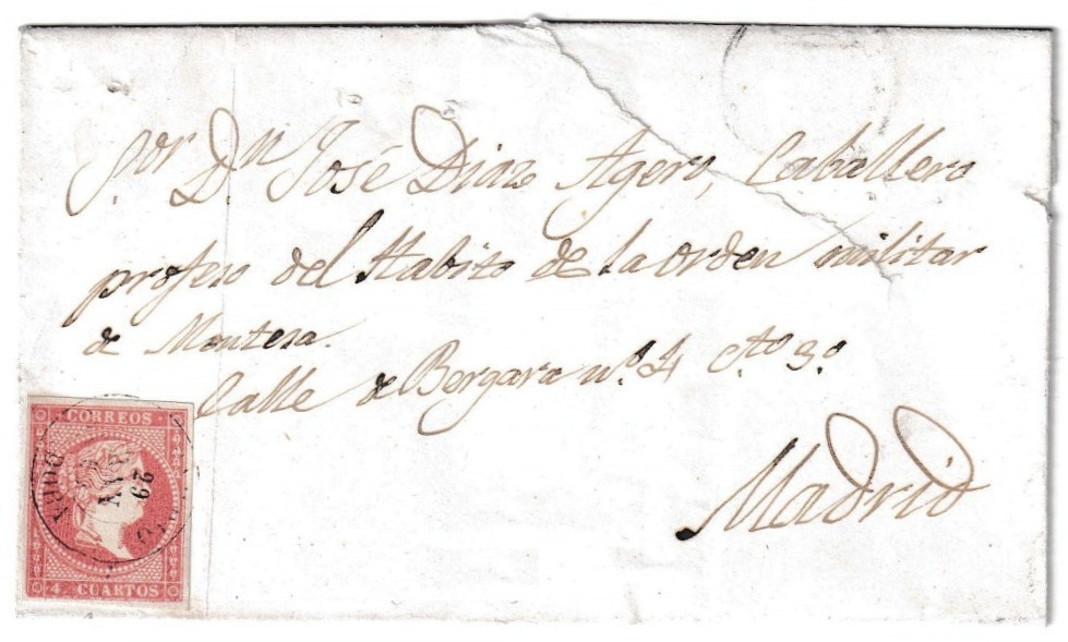 Envuelta circulada en el año 1859, remitida desde la localidad de El Carpio (Córdoba) con destino a Madrid. La carta, fechada el 29 de mayo de 1859, conserva un nítido matasellos local de 22 mm aplicado sobre un sello de 4 cuartos en color rojo, característico del reinado de Isabel II. El sello muestra una buena definición del grabado y está bien centrado, con un cancelado limpio que permite la lectura clara del nombre de la población de origen.