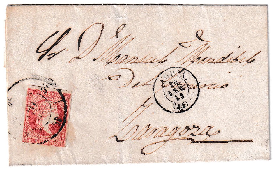 En el anverso de la cubierta se aprecia claramente la huella del sello manual, que se añade como elemento de autenticidad y precisión histórica, vinculado a los sistemas logísticos del periodo. Este tipo de piezas, además de su atractivo para los coleccionistas especializados en historia postal, proporciona una ventana única para analizar las rutas comerciales y administrativas entre ciudades como Soria y Zaragoza durante la época isabelina. Sin duda, este documento combina valor histórico y estético, siendo ideal para cualquier colección dedicada al periodo postal previo a las emisiones de sellos.