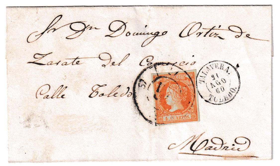 Envuelta circulada el 21 de agosto de 1860 entre Talavera y Madrid, en plena época isabelina, lo que la convierte en un interesante testimonio postal del siglo XIX. La pieza porta un ejemplar de 4 cuartos amarillo, franqueo habitual en aquellas décadas, pero que en este caso destaca por el matasellos aplicado: una rara e inusual Rueda de Carreta nº 57 correspondiente a la estafeta de Talavera. Esta cancelación es muy poco común y altamente valorada por los coleccionistas de prefilatelia y primeros usos postales en España.