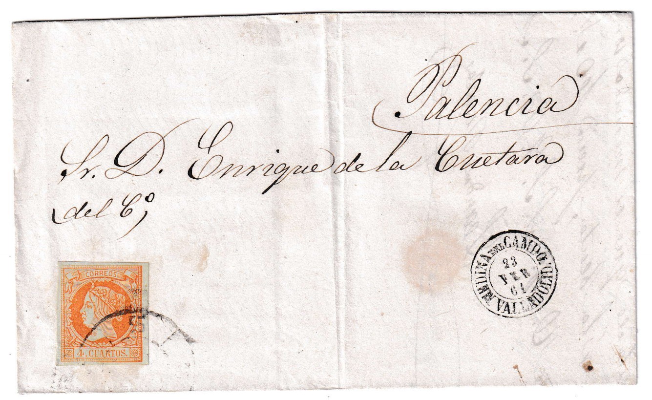 Interesante carta circulada el 23 de febrero de 1861 desde Medina del Campo con destino a Palencia, un testimonio postal de la España isabelina de mediados del siglo XIX. La pieza cuenta con un magnífico ejemplar del sello de 4 cuartos amarillo de la emisión de 1854, franqueado con la codiciada marca circular “Rueda de Carreta nº55” de Medina del Campo. Esta marca, utilizada en oficinas postales durante ese periodo, es particularmente escasa en esta población castellana, lo que convierte a esta carta en un documento postal de notable rareza e interés histórico.