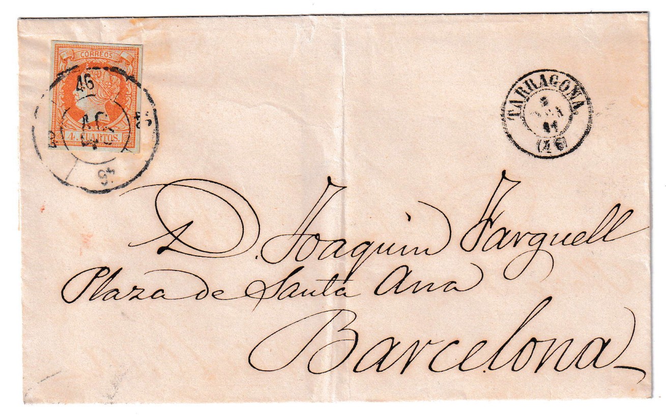 Envuelta completa circulada el 7 de noviembre de 1861 desde Tarragona con destino a Barcelona. Esta pieza de prefilatelia conserva una excelente presentación del periodo isabelino, marcada con un matasellos de Rueda de Carreta nº 46, distintivo de la oficina postal de Tarragona, aplicado sobre un ejemplar del sello de 4 cuartos amarillo de la emisión de 1860, con la efigie de Isabel II. El sello, bien centrado y con matasello claro, destaca por su conservación y contraste sobre el papel de la cubierta.