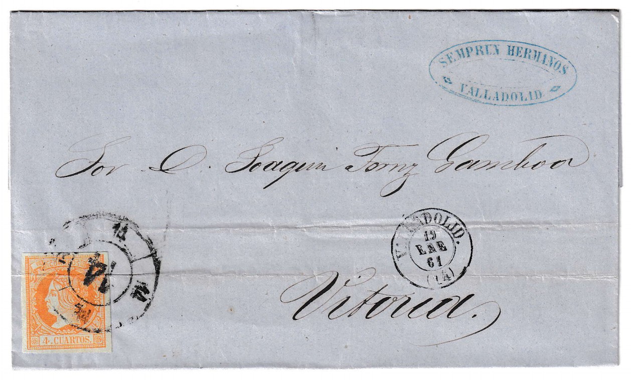 Envuelta circulada el 19 de enero de 1861, remitida desde Valladolid hacia Vitoria, en pleno reinado de Isabel II. Esta pieza de prefilatelia destaca por portar un ejemplar del distintivo sello de 4 cuartos amarillo, emitido en 1859, con la efigie de la reina grabada por el renombrado grabador Bartolomé Coromina. La obliteración se realizó mediante la clásica rueda de carreta nº14 de Valladolid, perfectamente visible y bien centrada sobre el sello. En el anverso luce también el matasellos fechador en tono azul, detalle menos común, que acentúa el valor postal e histórico de la pieza.