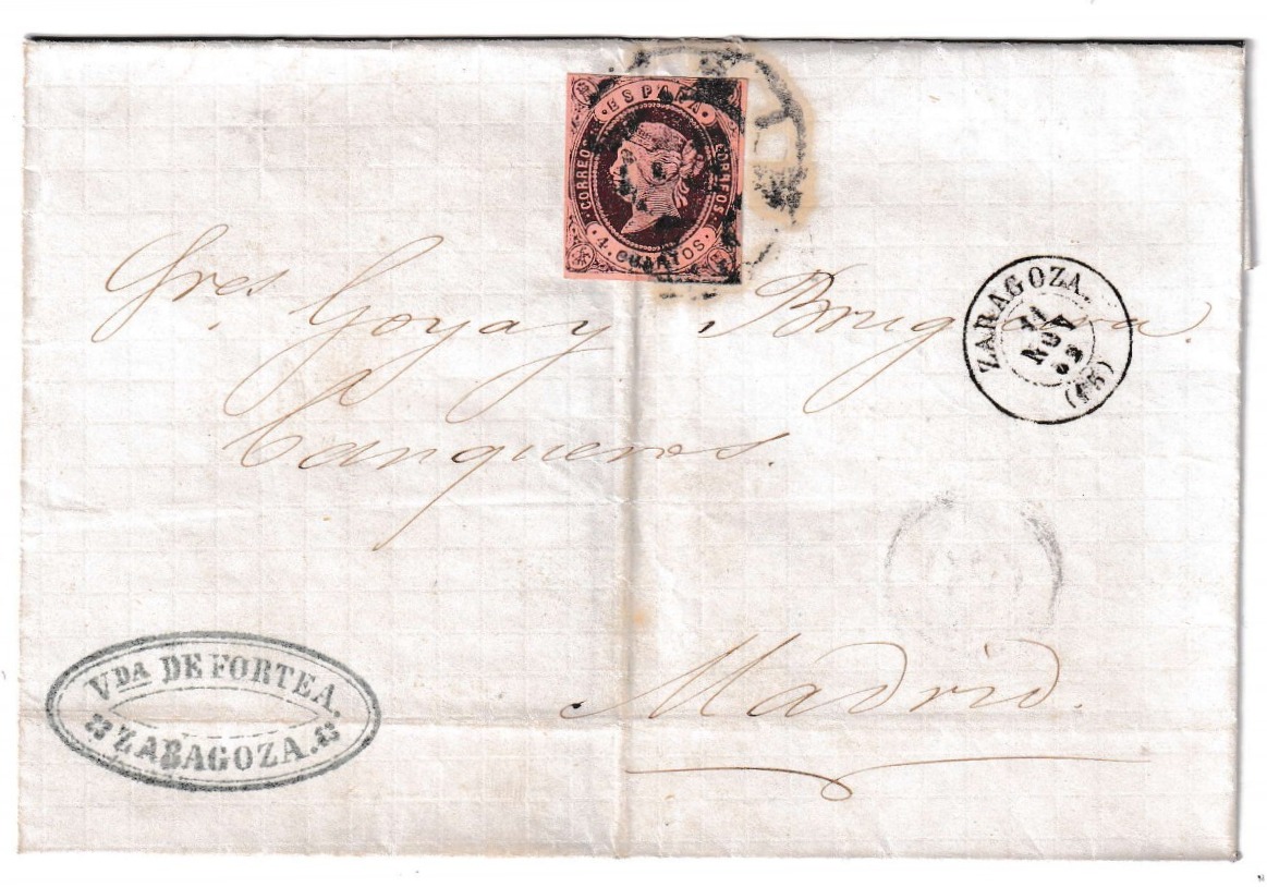 Envuelta histórica enviada desde Zaragoza a Madrid el 11 de noviembre de 1863, durante el reinado de Isabel II. La pieza conserva un excelente matasellos de tipo Rueda de Carreta nº15 de Zaragoza, perfectamente definido sobre un sello de 4 cuartos en tono castaño oscuro. Esta combinación ofrece una atractiva composición visual, característica de los correos de mediados del siglo XIX, y representa un excelente ejemplo del tránsito postal en plena época prefilatélica. La carta conserva el fecho original manuscrito y presenta una bonita conservación general, sin roturas ni alteraciones notables.