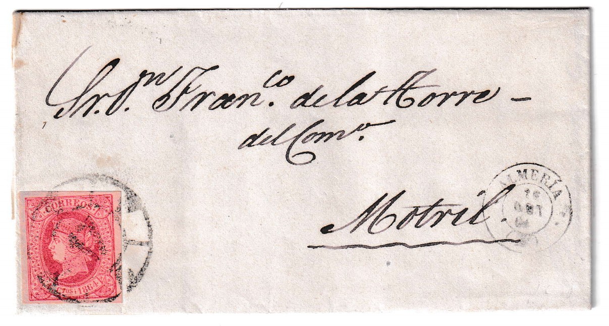 Carta circulada en 1864 desde Almería con destino a Motril, fechada con claridad el 30 de octubre de ese mismo año. En su anverso se aprecia un sello de 4 cuartos rojo de la emisión del reinado de Isabel II, cancelado mediante el característico matasellos de rueda de carreta nº 17, correspondiente a la oficina postal de Almería. Esta modalidad de matasellos, muy apreciada por los coleccionistas de prefilatelia española, era utilizada para inutilizar los sellos sin afectar la estética del sobre.