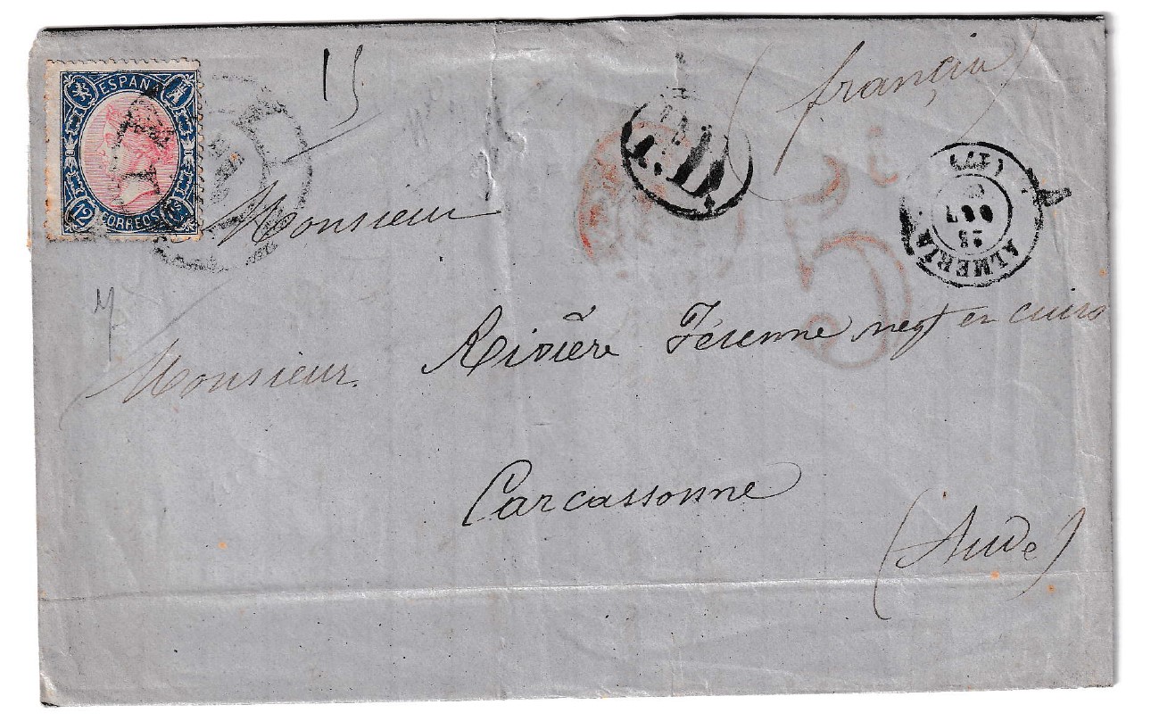 1865. Carta de Almería a Carcassonne, fechada el 23 de octubre de 1865. Esta interesante pieza de prefilatelia destaca por mostrar la marca de la rueda de carreta nº17 de Almería, estampada con gran claridad sobre un sello de 12 cuartos. Este tipo de marca postal, empleado en la segunda mitad del siglo XIX en España, aporta un carácter distintivo a la correspondencia de la época, resaltando la importancia de este sistema de matasellos en la organización del servicio postal.