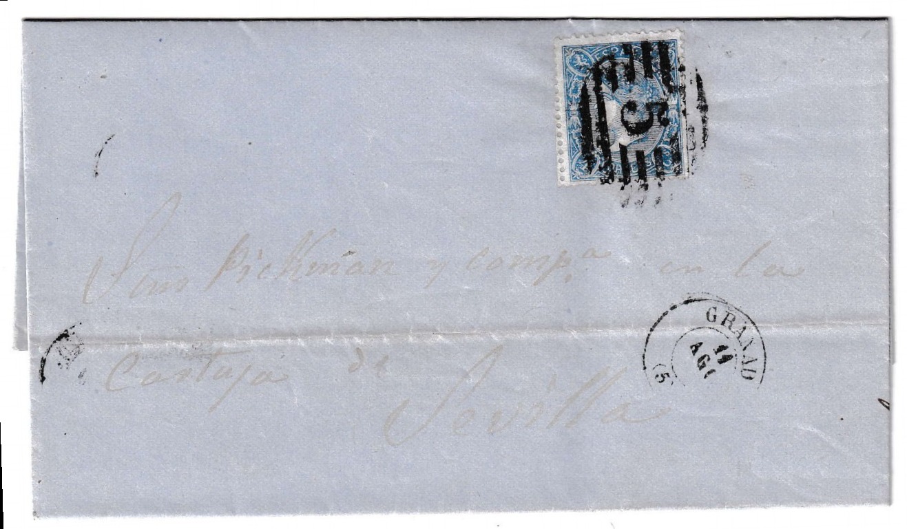Envuelta circulada de Granada a Sevilla, con fecha manuscrita del 11 de agosto de 1865. Esta pieza de prefilatelia representa un testimonio auténtico del correo español de mediados del siglo XIX, en una época previa al uso sistemático de sellos postales adhesivos. La carta cuenta con un claro matasellos de parrilla con numeral 5, que corresponde a la estafeta postal de la ciudad de Granada, perfectamente impreso en el anverso de la cubierta.