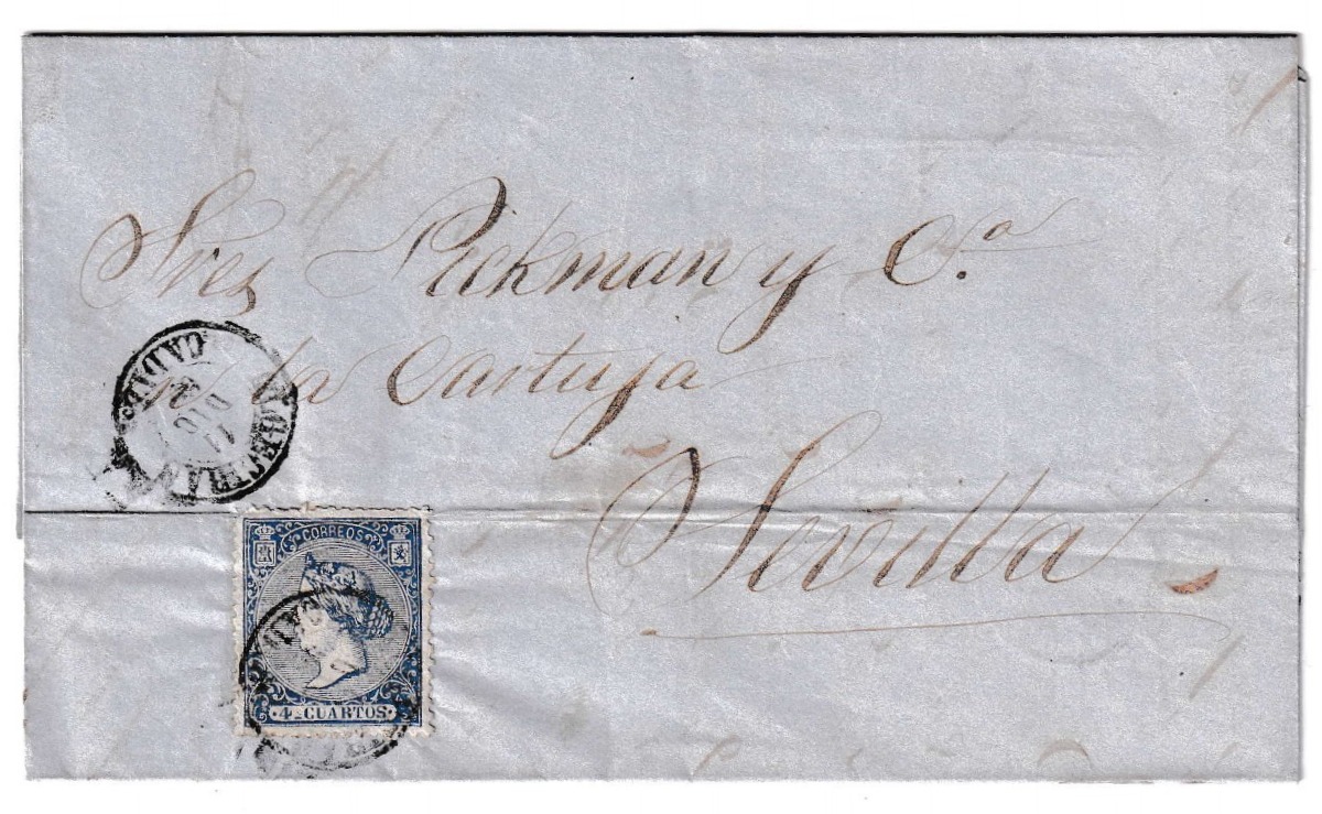 Carta circulada de Algeciras a Sevilla, fechada el 11 de diciembre de 1866, durante el reinado de Isabel II. La misiva conserva su sellado original con un ejemplar de 4 cuartos azul de la emisión de 1865, con la efigie de la reina orientada a la derecha, y matasellos en negro claramente visible. El sobre presenta en el anverso marcas postales manuscritas y el sello bien centrado, una combinación apreciada en el coleccionismo prefilatélico del siglo XIX.