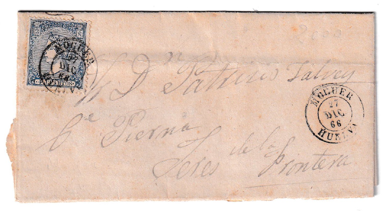 Carta enviada desde Moguer a Jerez de la Frontera el 27 de diciembre de 1866. Esta pieza histórica cuenta con un sello de 4 cuartos azul, debidamente matasellado, lo que confirma su circulación en la época. Destaca el fechador de Moguer, nítidamente impreso, un detalle que añade valor a la carta y realza su interés filatélico. El sobre se conserva en buen estado, con marcas propias del uso y el paso del tiempo, pero sin daños significativos que afecten su estética o integridad.