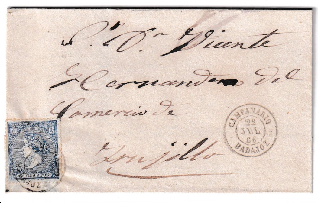 Envuelta circulada el 22 de julio de 1866 desde Campanario hasta Trujillo, durante el reinado de Isabel II, en plena etapa del segundo periodo filatélico español. La pieza presenta un sello de 4 cuartos color azul de la emisión de 1865-1866, con la efigie de perfil de la monarca. Este franqueo, diseñado con gran detalle y característico de la época, fue usado para envíos de correspondencia interior de bajo peso, y se aprecia bien centrado y con una impresión nítida, ligeramente matasellado en tono oscuro, propio del uso postal que certifica su autenticidad.