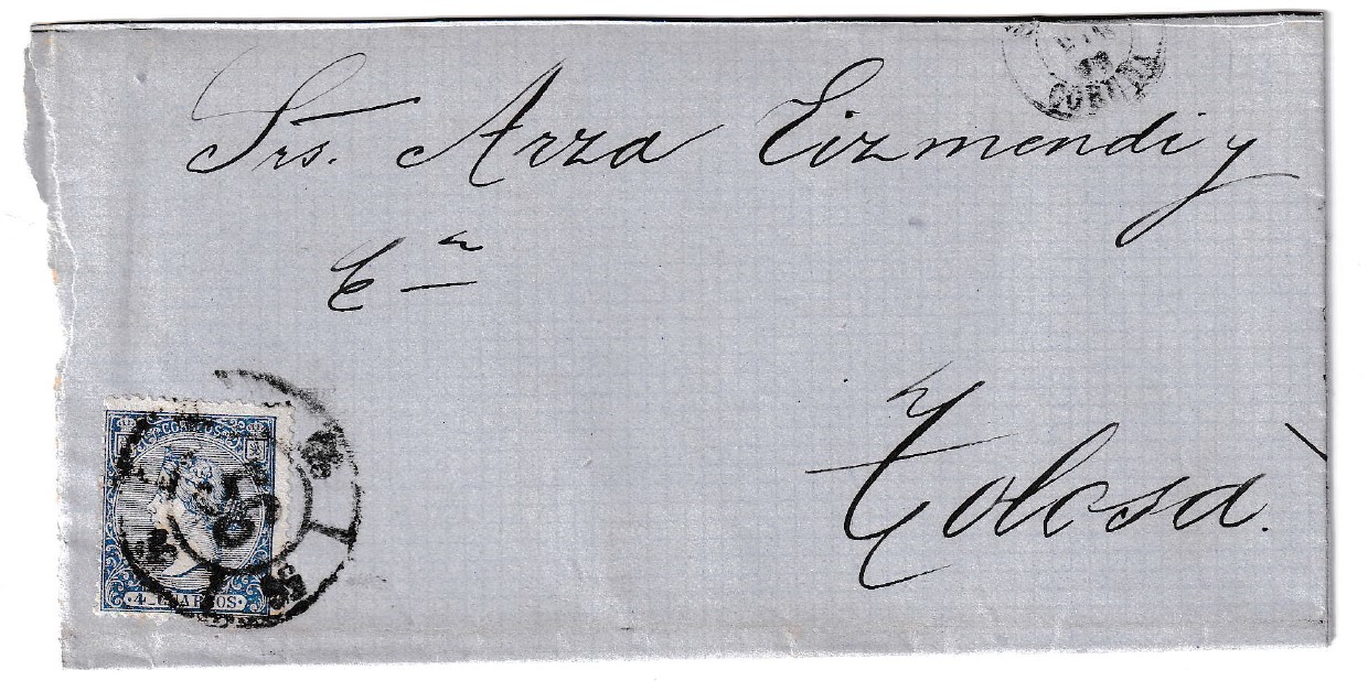 Envuelta fechada el 10 de diciembre de 1866, enviada de Santiago a Tolosa. Este interesante ejemplar lleva el distintivo sello de 4 cuartos azul, una emisión emblemática de la época isabelina. La pieza destaca por el claro matasellos de rueda de carreta nº56, impreso con buena nitidez sobre el sello, lo que la convierte en un atractivo ejemplo de la prefilatelia peninsular de mediados del siglo XIX. Su conservación es notable, evidenciando el paso del tiempo pero manteniendo intactos los elementos esenciales para su apreciación histórica.
