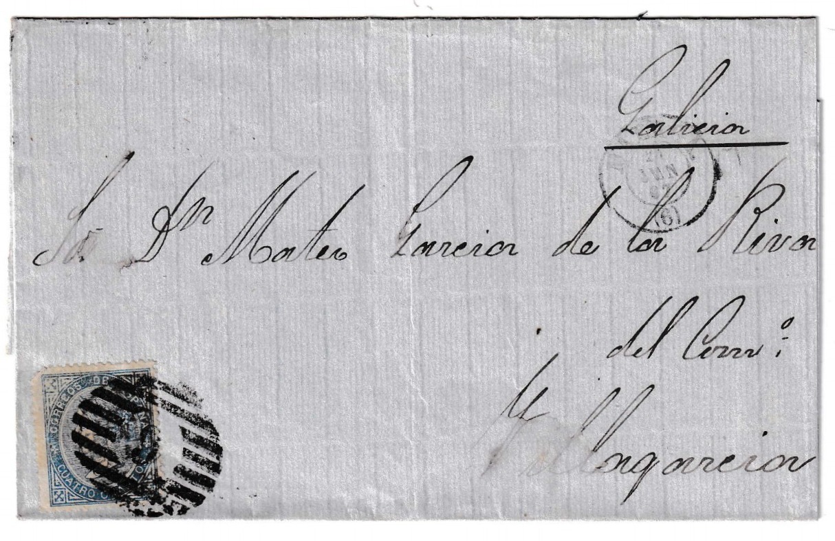 Envuelta circulada en el año 1867, enviada desde Málaga con destino a Villagarcía, fechada el 24 de junio de 1867. La pieza presenta en su anverso un sello de 4 cuartos azul, que conserva buena nitidez y centrado. El sello ha sido cancelado con el característico matasellos de parrilla numeral “6”, correspondiente a la oficina postal de Málaga, perfectamente visible y correctamente aplicado. Estas marcas no solo autentifican la circulación del documento, sino que también aportan un valioso registro postal de la época isabelina en España.