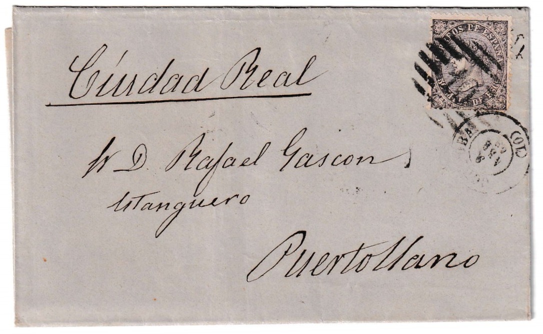 Envuelta circulada el 6 de abril de 1869 entre las ciudades de Córdoba y Puertollano, durante el vibrante periodo del Sexenio Democrático en España. Esta pieza de prefilatelia y filatelia temprana incorpora un ejemplar del sello de 50 milésimas violeta, correspondiente a la emisión de 1869, cuidadosamente cancelado con el distintivo matasellos de parrilla numeral «10», identificación postal correspondiente a Córdoba. La impresión del fechador manuscrito junto al matasello, ambos bien definidos, aportan autenticidad y contexto histórico a la pieza.