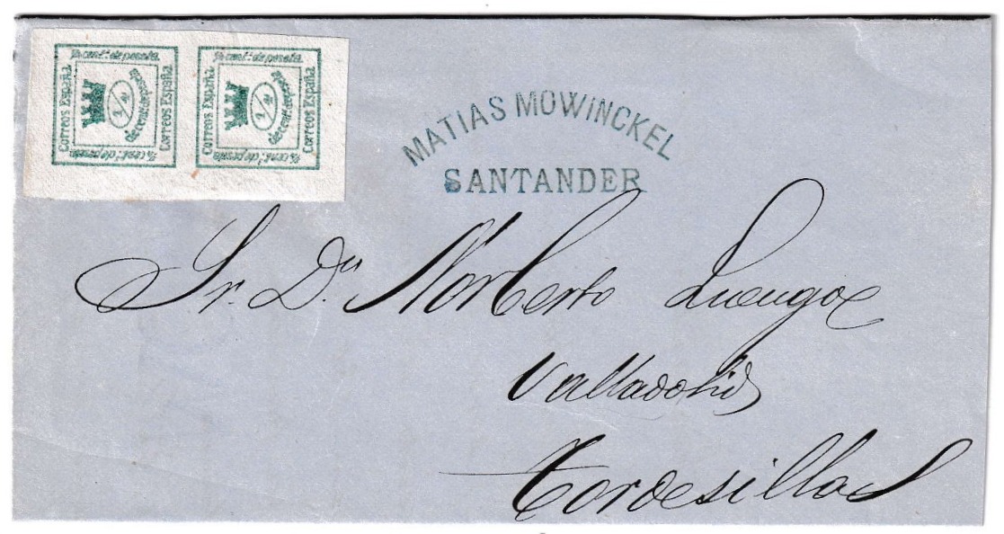 Carta circulada el 31 de octubre de 1874 desde Santander con destino a Tordesillas, durante los últimos compases del periodo del Sexenio Democrático en España. La pieza conserva su integridad y presenta el matasellos correspondiente con claridad, lo que permite su fácil datación. Al frente se aprecia el uso del característico sello de 2 cuartos verde conocido popularmente como «2 cuatillos», catalogado como la emisión de la corona mural, utilizada durante la Primera República Española. Este ejemplar muestra buena presencia y constituye un interesante testimonio postal del convulso periodo político de la época.