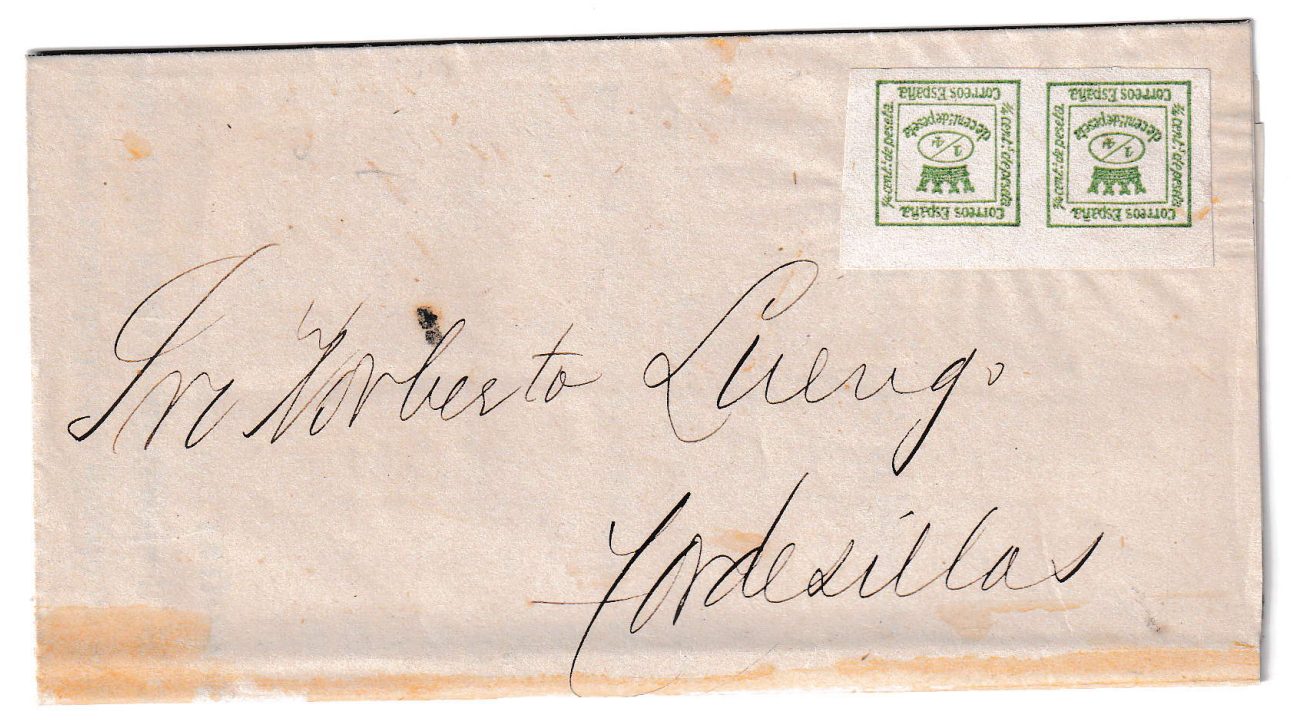 Carta impresa circulada el 15 de enero de 1876 desde Santander con destino a Tordesillas, en plena época de la Primera República Española. Esta pieza postal destaca por su diligente aplicación del doble porte correspondiente a la tarifa de impresos de la época, franqueada con sellos de 1 céntimo verde oscuro de la serie conocida como «corona mural», emitida entre 1873 y 1874. Se trata de una carta impresa de uso oficial, tipológicamente poco común, conservada en excelente estado, con matasellado bien marcado en el frente y completa de contenido.