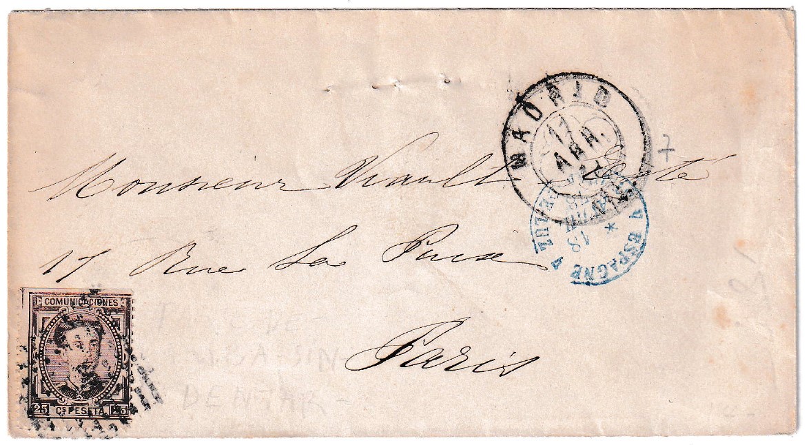 Sobre mecánico enviado de Madrid a París el 17 de abril de 1878, un fascinante testimonio de la correspondencia internacional en la segunda mitad del siglo XIX. Este sobre presenta la marca de la estafeta de cambio de Madrid claramente legible en el matasello de salida, un detalle que lo convierte en una pieza muy interesante para coleccionistas de prefilatelia y filatelia clásica. Además, incluye la llegada al punto intermedio de Saint Jean de Luz el 18 de abril de 1878, mostrando así su trayecto cuidadosamente registrado.
