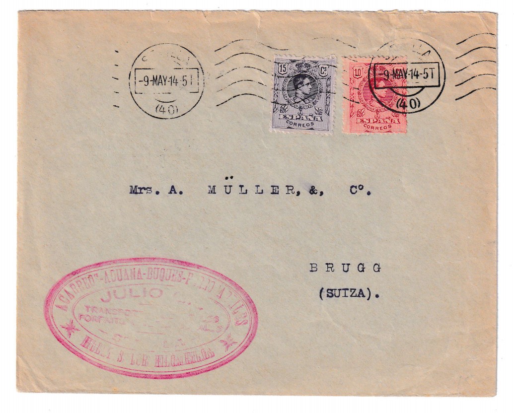 Raro sobre circulado desde Sevilla hasta Brugg (Suiza), fechado el 9 de mayo de 1914, apenas unos meses antes del estallido de la Primera Guerra Mundial. Esta pieza de prefilatelia española destaca por su franqueo compuesto por un 10 céntimos rojo y un 15 céntimos violeta del tipo Alfonso XIII Cadete, ambos cancelados con un bonito matasellos de rodillo mudo, característico del periodo. El sobre conserva el matasello perfectamente legible, lo que añade valor tanto postal como histórico a esta pieza.