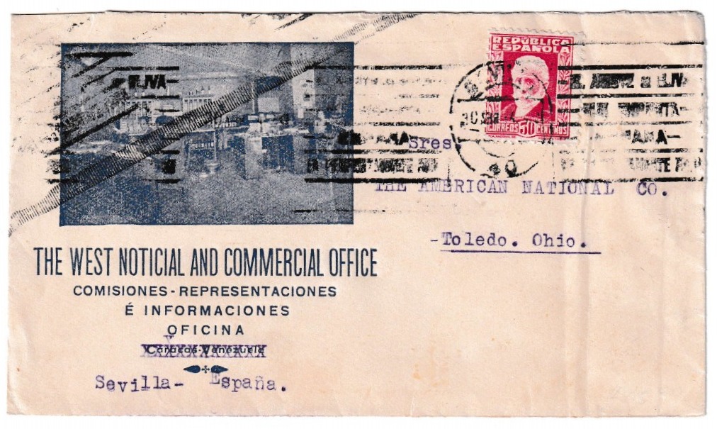 Raro sobre ilustrado circulado de Sevilla a Ohio con fecha del 30 de septiembre de 1934, en plena II República Española. La pieza destaca por su ilustración temática impresa en el anverso, que conserva vivos detalles y añade un gran atractivo visual al conjunto. Este tipo de sobres ilustrados eran poco comunes en su época, especialmente en correspondencia internacional, lo que incrementa notablemente su valor filatélico. Cuenta con franqueo correcto mediante sello de 30 céntimos de la serie republicana, cancelado con un matasello de rodillo alusivo a la promoción del «Aceite de Oliva«, campaña habitual en aquellos años dirigida tanto al mercado nacional como extranjero.