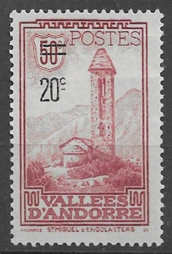 Sello de la Andorra Francesa emitido en 1935, correspondiente al catálogo Yvert con el número 48. Se trata de una interesante pieza con sobrecarga tipográfica «20c» aplicada sobre un sello anterior de 50 céntimos, lo que refleja las necesidades postales y ajustes económicos de la época. Este tipo de emisiones resultan especialmente atractivas para los coleccionistas especializados en territorios con administración postal compartida, como el caso andorrano.