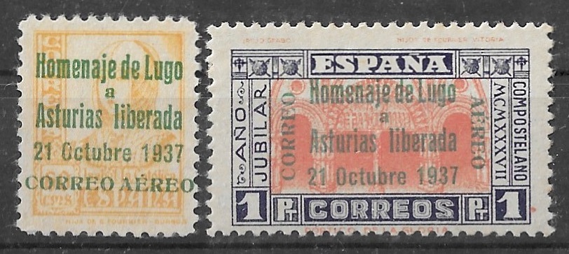 Emisión Local Patriótica de Lugo, año 1937, correspondiente a la Guerra Civil Española. Serie completa formada por los valores Nº 11 y Nº 12 según el catálogo Edifil, emitidos por el comité local durante uno de los periodos más convulsos de la historia contemporánea de España. Estos sellos destacan por su finalidad propagandística y por su emisión limitada, lo que convierte esta serie en un testimonio relevante del contexto político y social de la época.