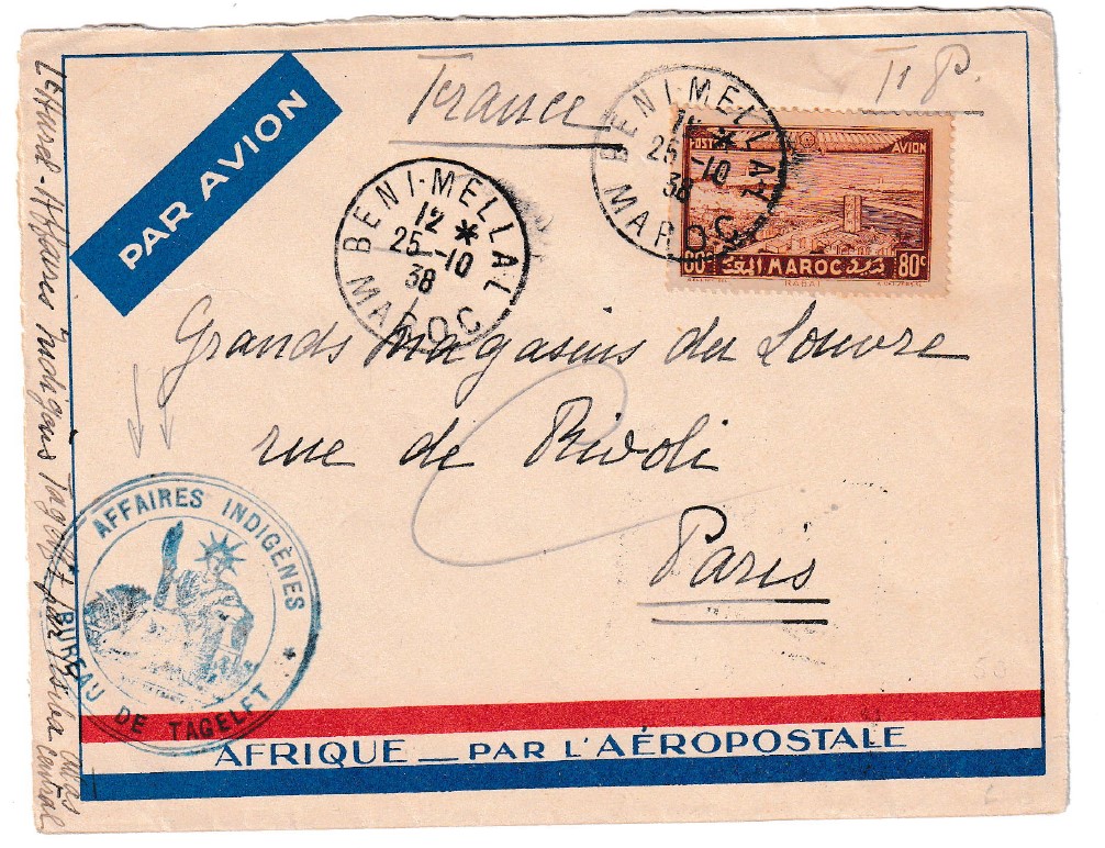 1938. Correo aéreo de Beni Mellal (Marruecos) a París. Carta histórica fechada el 27 de octubre de 1938, enviada desde la localidad de Beni Mellal, en Marruecos, durante la época del Protectorado Francés. Esta pieza filatélica destaca por su recorrido hacia París a través del servicio de correo aéreo, un medio innovador y cada vez más utilizado en aquella época, lo que añade un interés histórico y técnico significativo. Con un matasellos claro que certifica su origen y tránsito, representa una prueba tangible de las conexiones postales internacionales en el período de entreguerras.