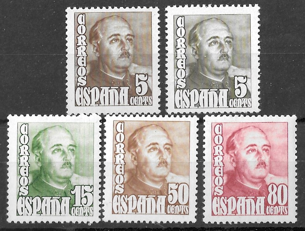 Serie de sellos de España emitida entre los años 1948 y 1954, perteneciente al periodo del régimen franquista, con la imagen del General Francisco Franco. Este conjunto está compuesto por las emisiones Edifil nº 1020 al 1023 junto con una interesante variante del sello de 5 céntimos en color gris. Todos los sellos se presentan sin fijasello, conservando así su integridad original, una característica muy valorada entre los coleccionistas de piezas filatélicas históricas.
