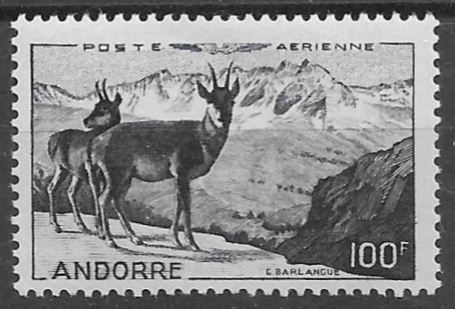 1950. Andorra Francesa. Primer sello de Correo Aéreo, catalogado como Nº 1 en Yvert. Esta pieza emblemática representa el nacimiento del servicio postal aéreo en la Andorra administrada por Francia, y constituye un verdadero hito dentro de la filatelia andorrana. El sello se presenta sin fijasello, una condición muy valorada por los coleccionistas más exigentes, ya que preserva completamente su goma original y aumenta su rareza y atractivo en el mercado.