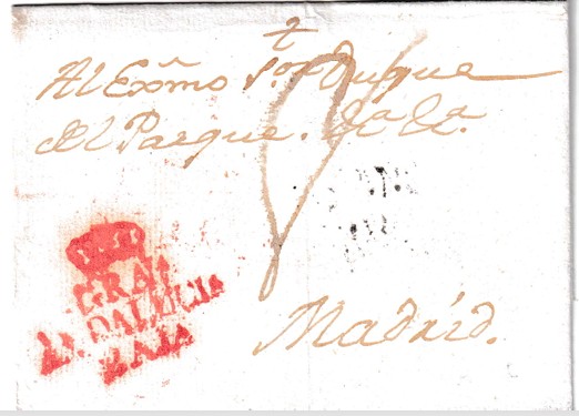 Envuelta circulada entre Granada y Madrid durante el periodo de 1816 a 1819, perteneciente al sistema de prefilatelia española anterior a la implantación del sello postal. Esta pieza histórica muestra una clara marca en rojo de “GRAIª ANDALUCIA BAJA”, coronada, evidencia del funcionamiento administrativo y postal del sur peninsular a comienzos del siglo XIX. La contundencia del matasello y su nitidez aportan un alto valor documental y estético a la pieza, siendo testigo del tráfico epistolar en la España postnapoleónica.